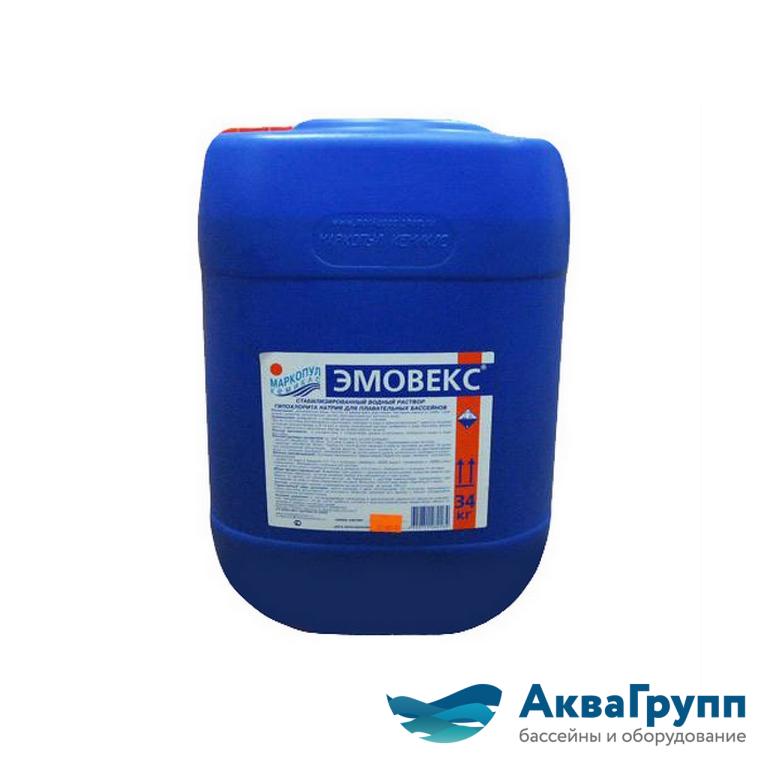 "Эмовекс" жидкий хлор, обеспечивает полную дезинфекцию воды и осуществляет её защиту от бактериальных загрязнений; позволяет получить чистую прозрачную воду, лишенную водорослей и бактерий, предупреждает образование известкового налета. Состав: гипохлорит натрия, стабилизатор (содержание активного хлора – не менее 130 г/л).