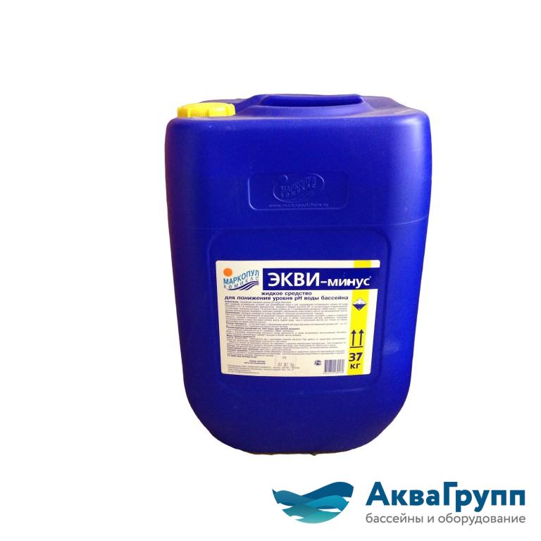Экви-минус (жидкое средство) понижает кислотность среды и улучшает pH до нормального уровня. Состав: раствор неорганической кислоты, антикоррозийные добавки, содержание основного вещества — 38%. В дополнении к основному своему свойству — понижению уровня рН, «Экви-минус» при регулярном использовании выполняет еще и роль «декальцита» (средства препятствующего образованию известковых отложений на облицовочной плитке и металлических поверхностях).