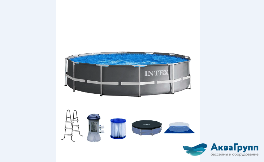 Каркасный бассейн для взрослых и детей 26724 INTEX. Стенки бассейна: два слоя ПВХ, стойкого к ударам, растягиваниям и воздействию солнечных лучей, один слой - из полиэстера, укрепляющего стенки бассейна. Прочность бассейна обуславливается его стальным каркасом с усиленным порошковым покрытием стальных труб, благодаря которому бассейн выдерживает большие нагрузки. Поддержанию формы способствует лента из полипропилена, "опоясывающая" весь бассейн. Установка бассейна не требует подготовки грунта. Процесс сборки менее часа. Сливной клапан присоединяется к садовому шлангу. В комплект входят: Бассейн, Фильтр-насос производительностью 3785 л/час, Картридж тип А, Защитный ковер, Тент, Лестница. Характеристики бассейна: Диаметр 457 см, высота 107 см. Материал: трехслойный ПВХ, стальной каркас. Толщина стенок полотна: 0,52 см. Объем: 14614 литра при наполнении на 90%. Диаметр отверстия для подключения шлангов: 32 мм. Вес: 66,4 кг. Рекомендован к использованию для дачи и дома.