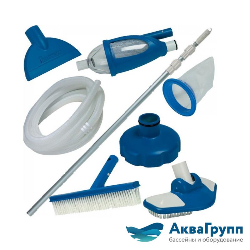Полный набор инструментов Deluxe для чистки бассейна от компании Intex. Включает в себя высокоэффективные приспособления для поддержания чистоты воды, дна и стенок бассейна.