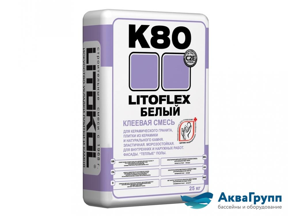 Клей LITOFLEX K80 БЕЛЫЙ водо-, морозостойкий. Экологически безопасен, не содержит волокон асбеста.