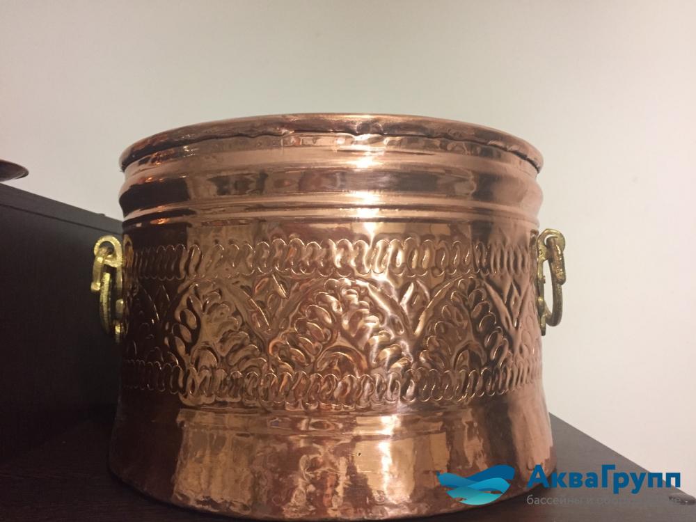 Медная емкость ЕМ-15 высота 23 см., диаметр 32 см. Изготовлено вручную из меди. По всей поверхности изделия выполнены цветочные узоры.