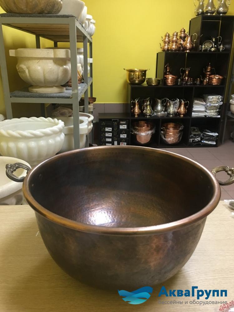 Глубокий медный таз, предназначен для создания специального мыльного раствора, с помощью которого проводится пенный массаж.