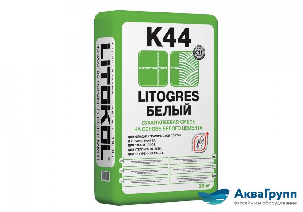 LITOGRES K44 БЕЛЫЙ — цементный клей (С) базовый (1) тиксотропный (Т), относится к классу C1Т согласно классификации Европейских Норм EN 12004 и ГОСТ Р 56387. LITOGRES K44 БЕЛЫЙ – сухая клеевая смесь на основе белого цемента и песка, содержит специальные синтетические смолы и химические добавки, придающие продукту после разведения водой эластичность и высокую адгезию на традиционных строительных основаниях. Высокоэффективный клей на цементной основе для керамической плитки и керамогранита Приготовленный клеевой раствор имеет высокую водоудерживающую способность, высокую клеющую способность и тиксотропность, технологичен, удобен в работе. При облицовке вертикальных поверхностей с помощью LITOGRES K44 БЕЛЫЙ сползание плитки отсутствует. Клей LITOGRES K44 БЕЛЫЙ — влаго-, морозостойкий. Экологически безопасен, не содержит волокон асбеста.
