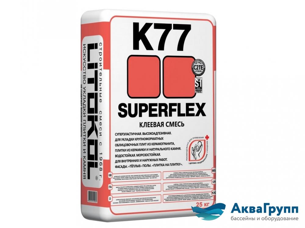 SUPERFLEX K77 — клеевая смесь, предназначенная для укладки любого типа плитки из керамогранита, керамики и натурального влагоустойчивого камня, в том числе большого формата. Применяется при внутренней и наружной облицовке стен и полов.