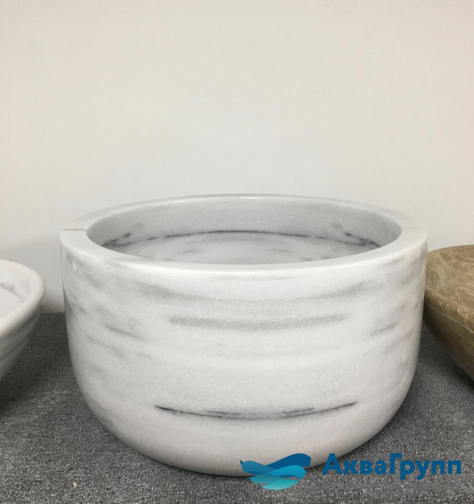 Курна круглая из белого мрамора Мармара Беяз с серыми полосами. Плотный искрящийся мрамор и глубокая чаша выполненная в современном стиле.