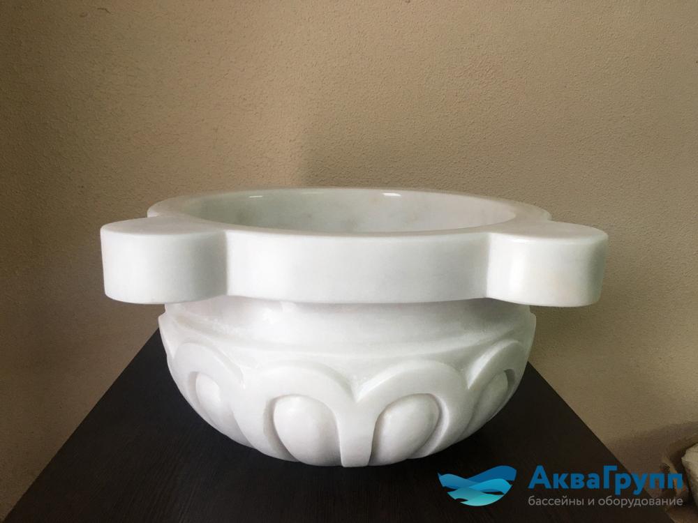 Курна для хамама вырезана из цельного блока белого мрамора "Афьон Бейяз" турецкими мастерами вручную. Искрящийся белый мрамор также называют "сахарным" за его белизну и прозрачность.