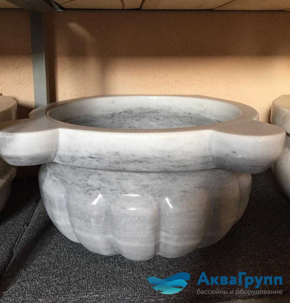 Курна изготовлена из мрамора "Мармара". Этот мрамор один из популярных турецких мраморов белого цвета. Особый эффект мрамору придают широкие серовато-дымчатые прожилки, благодаря которым можно создавать различные комбинации с другими материалами. Качество камня отличается низким водопоглощением и долговечностью.