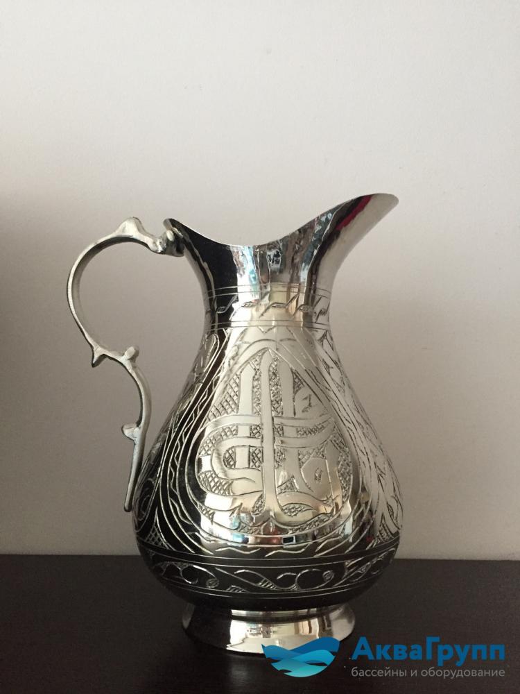 Кувшин меедный для хамама серебристого цвета с тиснением. Кувшин предназначен для обильного ополаскивания холодной водой, а также для смывки пены, скраба и т.д. Кувшин может быть применен не только практически, но и также являться замечательным украшением вашего интерьера.