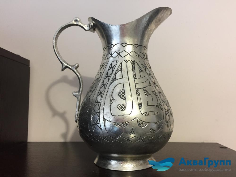 Кувшин металлический, состаренный для омовения в хамаме. Великолепная гравировка кувшина, стальной цвет, а также искусственная состаренность отразит волшебство восточной культуры.