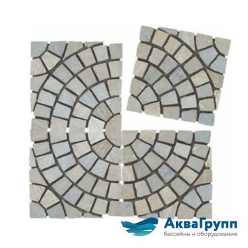 Мозаика из натурального камня. Сланец и Гранит. Камни разных цветов и размеров. Толщина камней от 15 до 35 мм. Основное использование для укладки тротуаров и пешеходных зон. Средний и высокий ценовой сегмент.