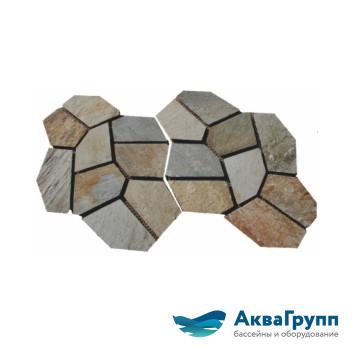Мозаика из натурального камня. Сланец и Гранит. Камни разных цветов и размеров. Толщина камней от 15 до 35 мм. Основное использование для укладки тротуаров и пешеходных зон. Средний и высокий ценовой сегмент.