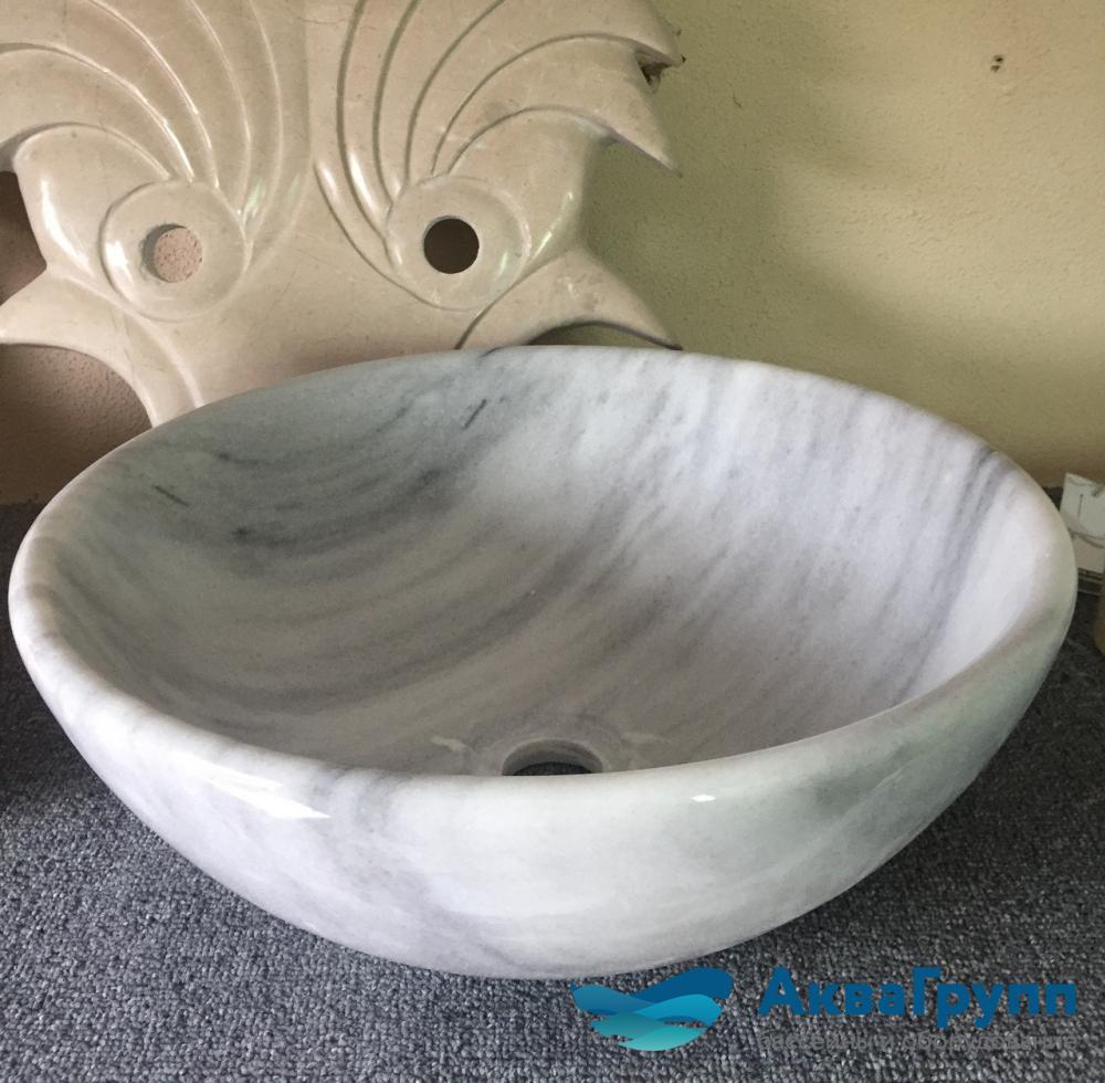 Мраморная раковина белая с серым, со сливным отверстием из мрамора Мармара