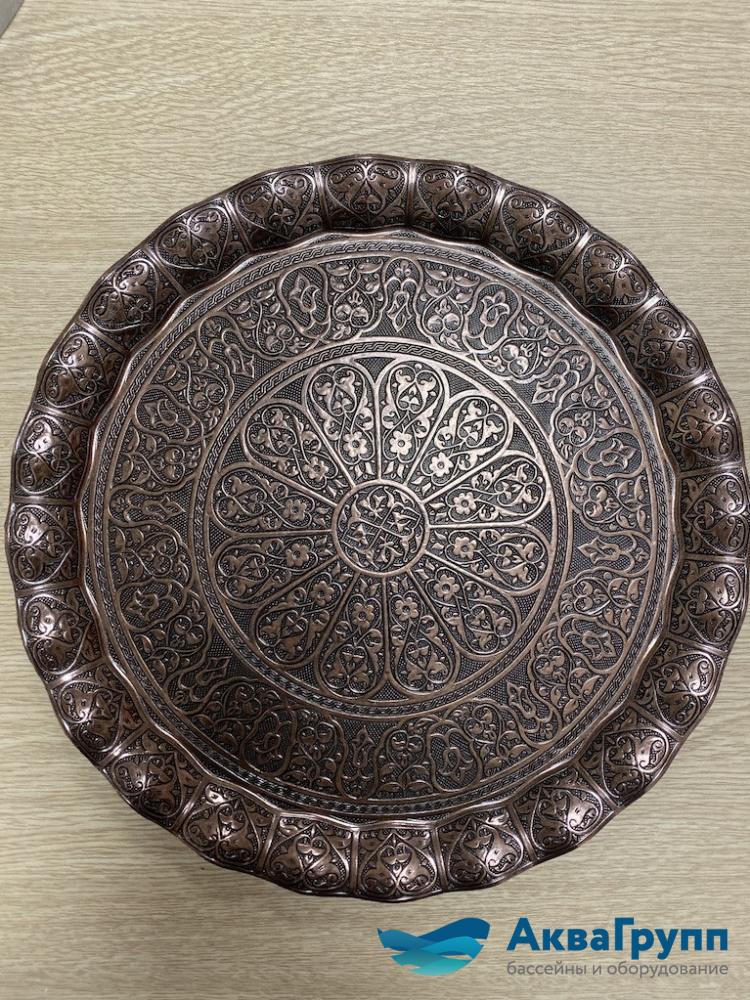 Одна из процедур хамама – церемония чаепития. Чай подносят в специальных турецких стаканах, которые приносят на традиционных подносах. Утонченность очертаний узора, золотой цвет и оригинальность формы – это то, что вам нужно. Золотой цвет подноса великолепно дополнит богатство вашего хамама.