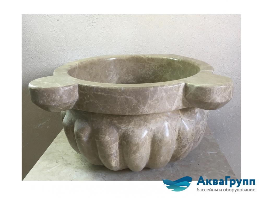 Курна для хамама сделана из цельного блока мрамора "Имперадор Лайт" турецкими мастерами вручную. Благодаря полупрозрачности мрамора можно увидеть легкие прожилки, переплетающиеся в причудливые узоры, созданные самой природой. На курне имеются круглые подставки, на которые кладут чаши для омовения (хамам таши).