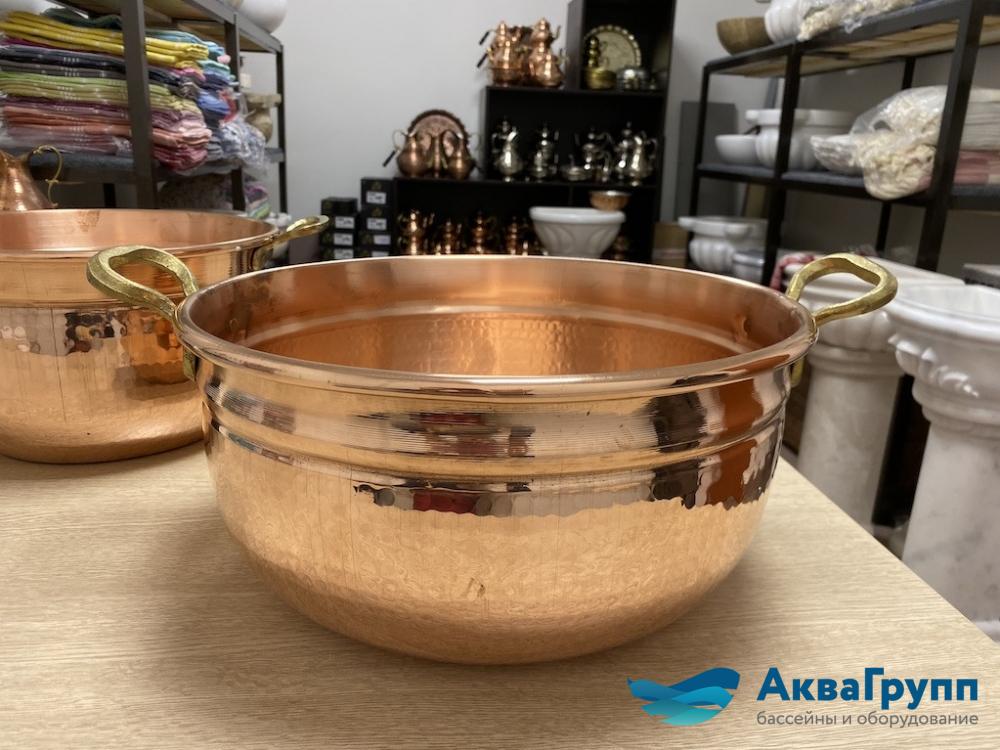 Глубокий медный таз, предназначен для создания специального мыльного раствора, с помощью которого проводится мыльный массаж.