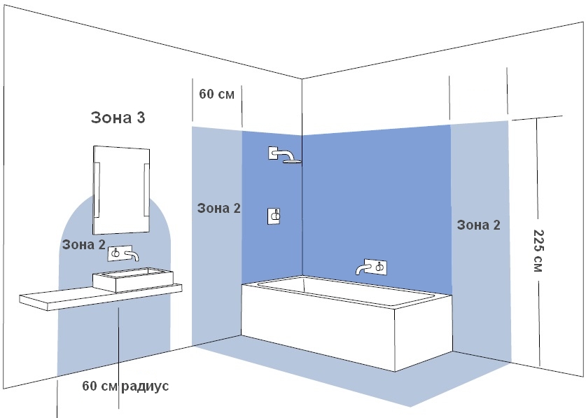 Недопустимо расположение розеток с напряжением 220В в зоне 1. В зоне 2 разрешено использование розеток с классом влагозащиты 4, в зоне 3 – с классом 1.
